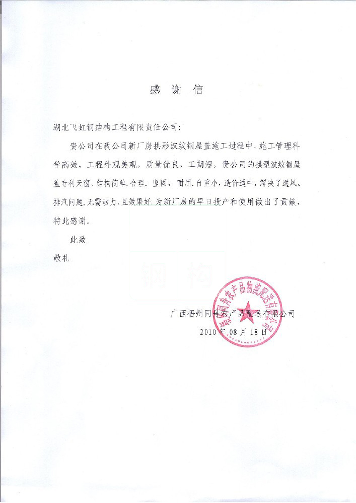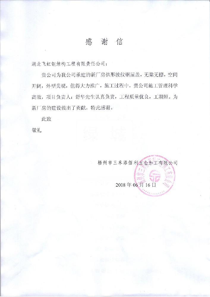 梧州市三禾添佰利五金加工有限公司感谢信